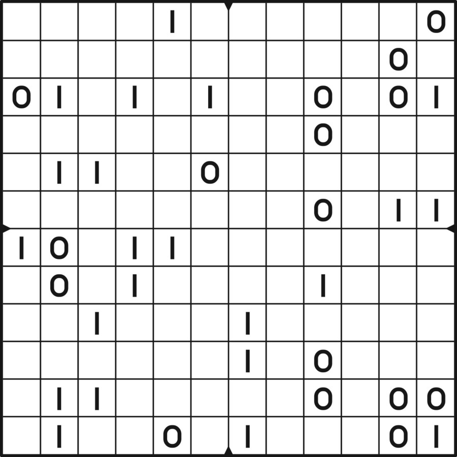 A daily binairo puzzle! Solve each puzzle with only 0's and 1's. Remember: No more than two the same numbers may be placed directly next to or below each other. Every row and every column must contain as many zeroes as ones. The combination of zeroes and ones in every row must be unique, as does the combination in each column.